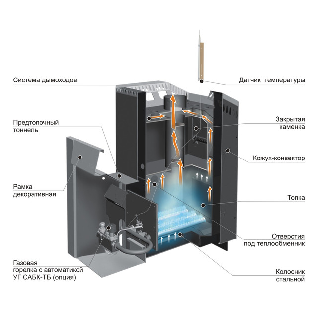 Печь обладает специальной конструкцией топки и организацией дымоходных каналов для максимальной эффективности для работы на газе. Сводом топки служит усиленное дно каменки с увеличенной толщиной металла. Внутренняя каменка приближена к месту горения газовой горелки для наибольшего эффекта нагрева. За счет этого увеличился объем закрытой каменки.